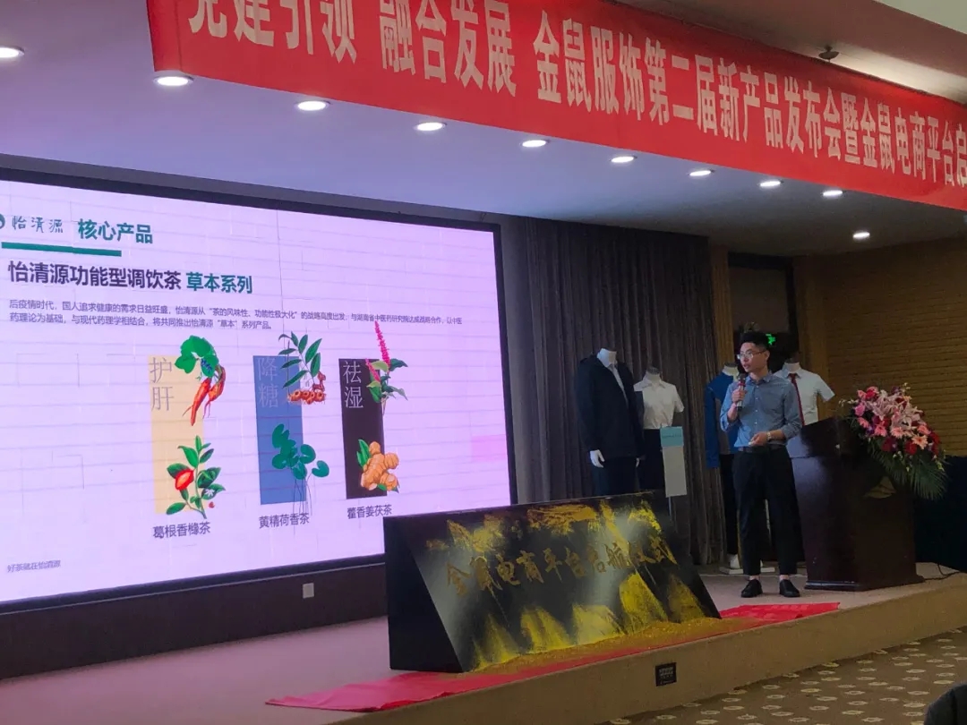 2021年5月15日,第二届金鼠服饰新品发布会暨金鼠电商起航仪式在北京举行,怡清源养生茶亮相北京。