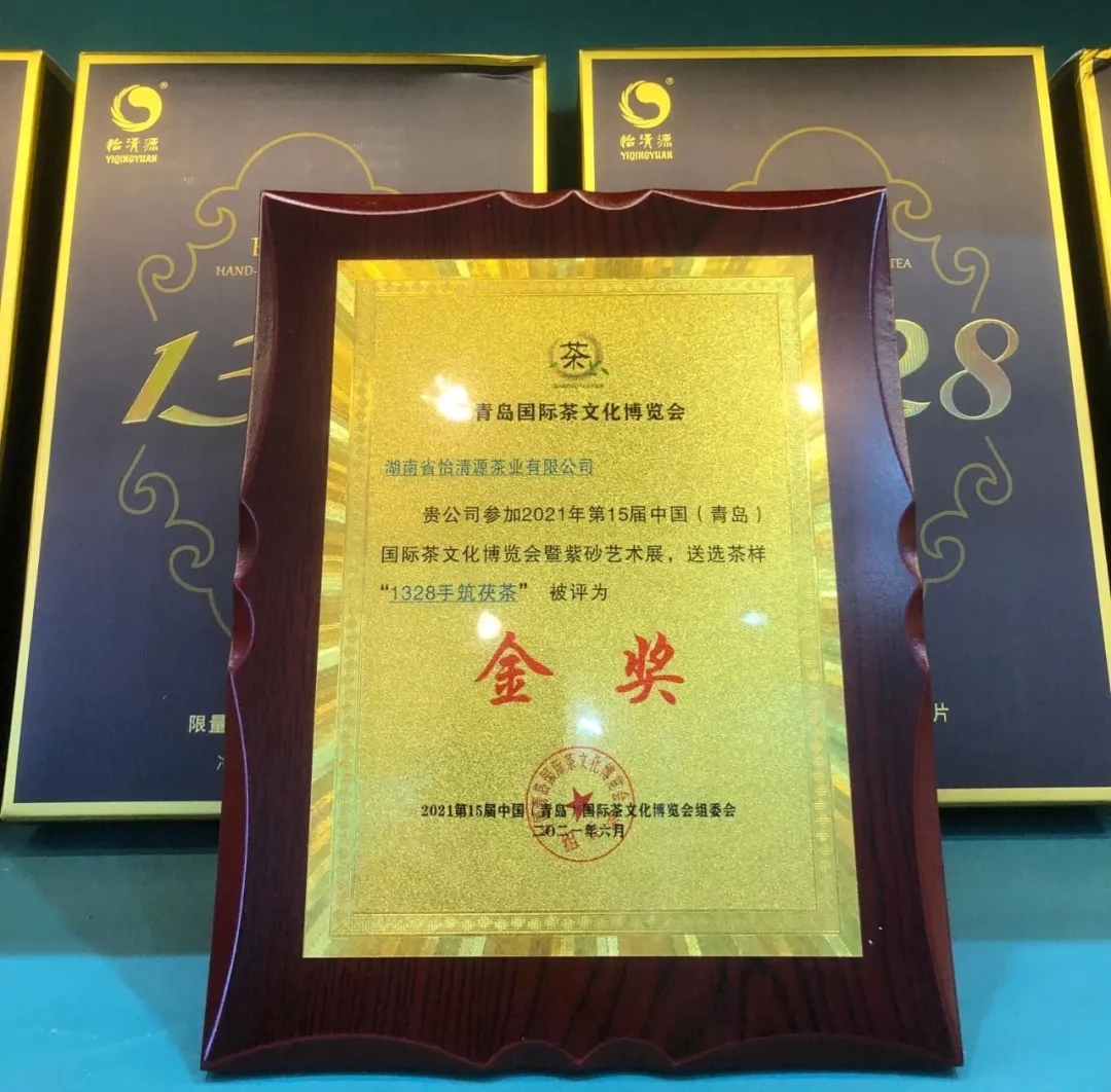 6月11日,2021第15届中国(青岛)国际茶文化博览会暨紫砂艺术展盛大开幕,怡清源1328手筑茯茶荣获金奖殊荣。