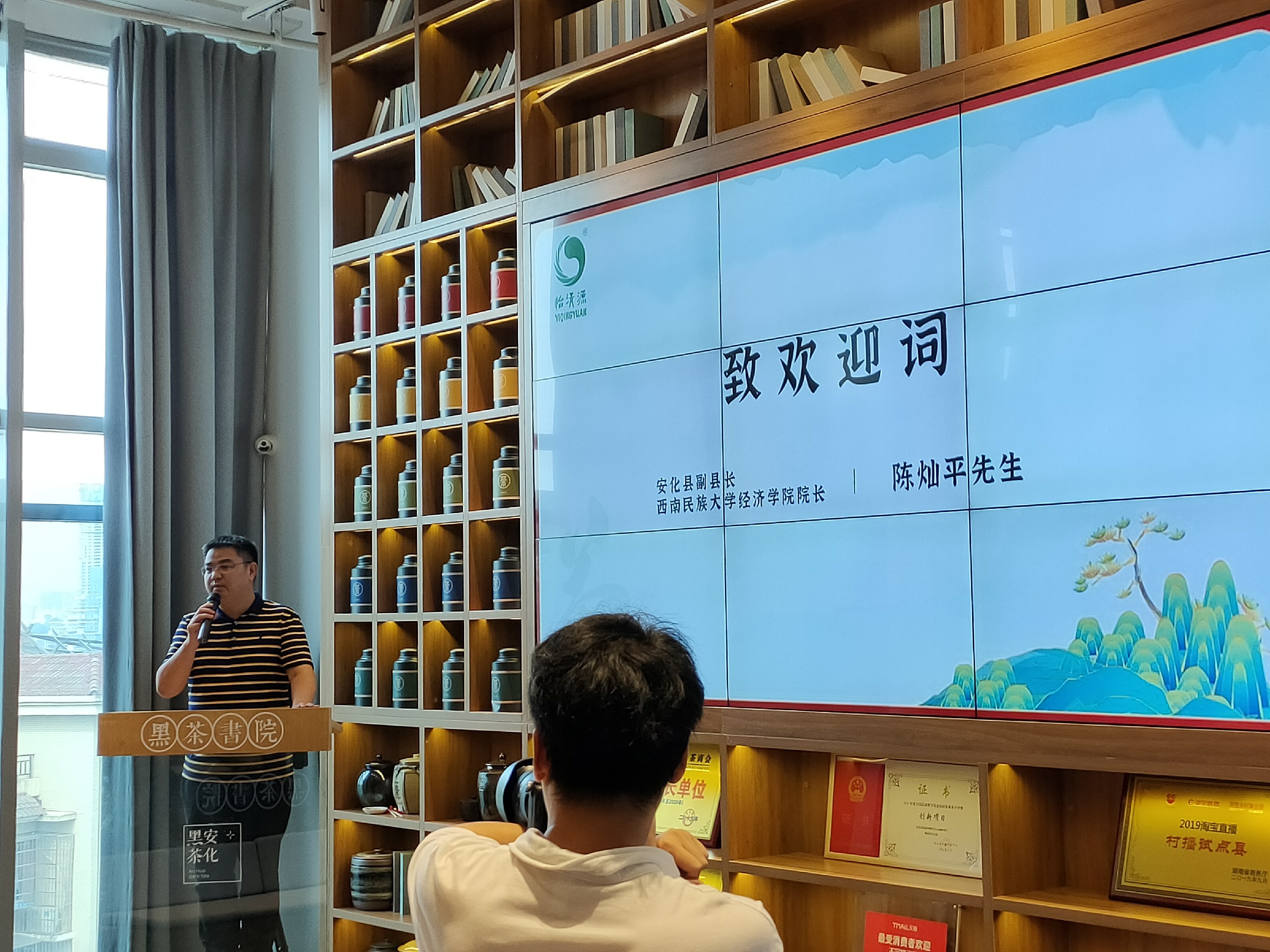 西南民族大学经济学院院长,安化县副县长陈灿平先生,安化黑茶离岸孵化中心理事长向懿先生、安化梅山城投副总经理刘雄、湖南省怡清源茶业有限公司创始人、总经理简伯华先生,湖南省怡清源茶业有限公司副总经理、安化怡清源茶业公司总经理周静先生,湖南省怡清源茶业有限公司副总经理康晓玲女士以及安化黑茶离岸孵化中心和怡清源公司的相关工作人员齐聚一堂见证这一历史性的时刻。